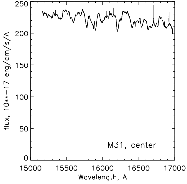 We dedicated a few APOGEE fibers in order to investigate what we can get for extragalactic studies in the frames of an APOGEE ancillary program in 2011. We have observed centers of M31, M32, and M110 in single APOGEE fibers (2” diameter) with the 2.5m telescope. Below is a table of the signal-to-noise obtained with one “visit” (67 min exposure time, typically with a plenty of Moon light). In addition to the center-of-galaxy exposures, a few fibers were allocated at “SDSS plate collision distance” (typically 80 arcsec) from the center of M32 along the minor and major axes. Figures below show combined spectra of the centers of M31 and M32, unbinned in the spectral direction, some 10 visit combined. The most prominent lines are Fe, Mg, Si, Al, and some molecular bands (CO).