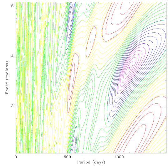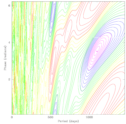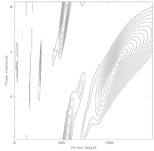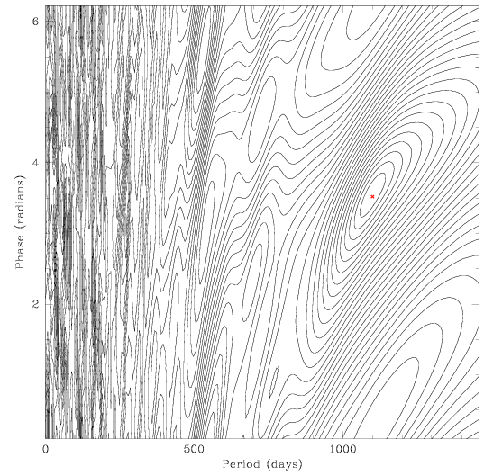(Left) Contour plot showing the distribution of rms values in period and phase.