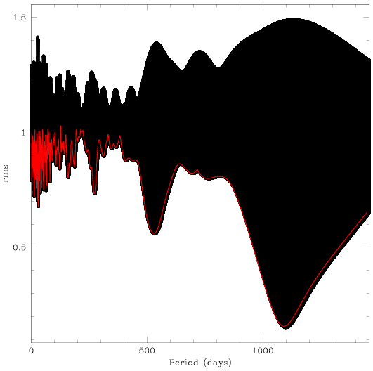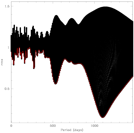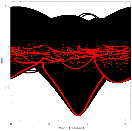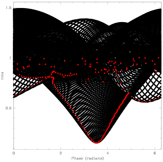 radians. The red points are the lowest rms values for each period value.