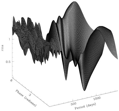 (Left) Surface plot showing the distribution of rms values in period and phase.