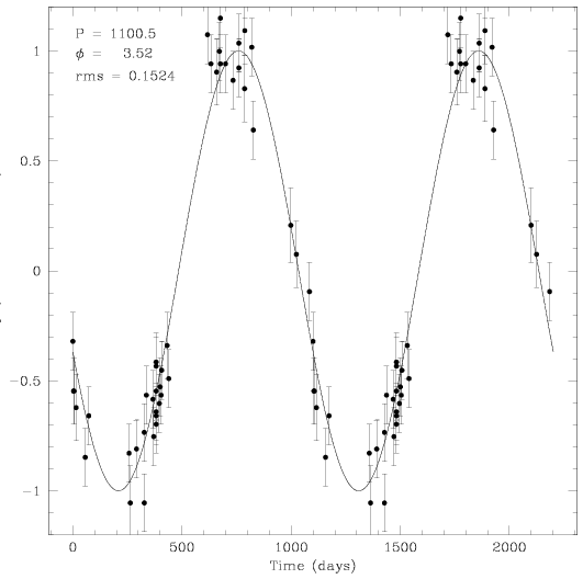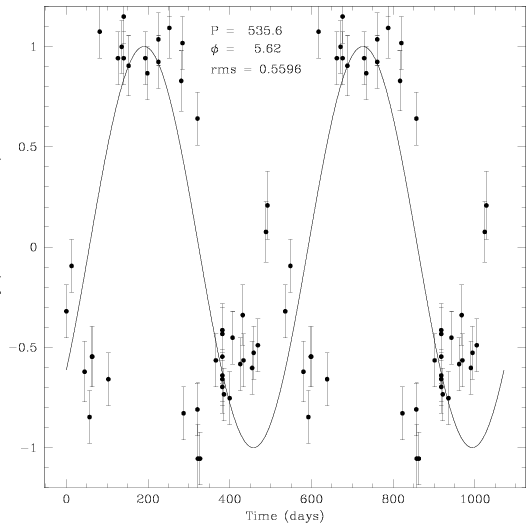 (Right) Plot of rms as a function of phase; the spread in rms for each phase value is caused by varying the period from 0 to 1460 days. The red points are still the lowest rms values for each period (not phase) value.