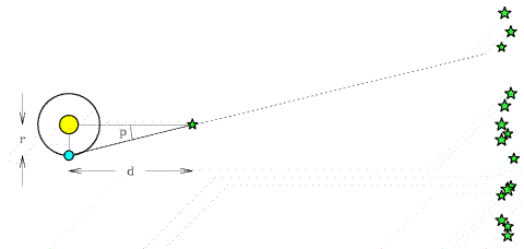 What happens to p if the star is further away? We can see that as the distance d to the star increases, the parallax angle decreases. For the nearest stars like Alpha Centauri, p is less than an arcsecond (0.77 arcseconds), and it is even less than that for all other stars in other solar systems. Parallax can thus be used to measure the distances only to relatively nearby stars, those close enough that the change in their angular position over six months is larger than the sensitivity of our measurement of that angle.